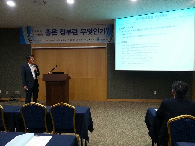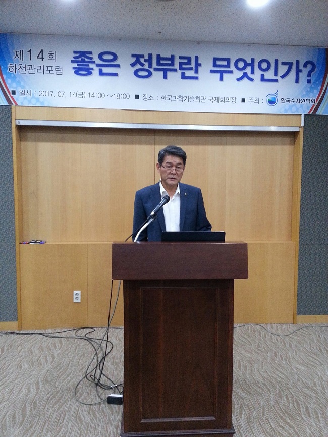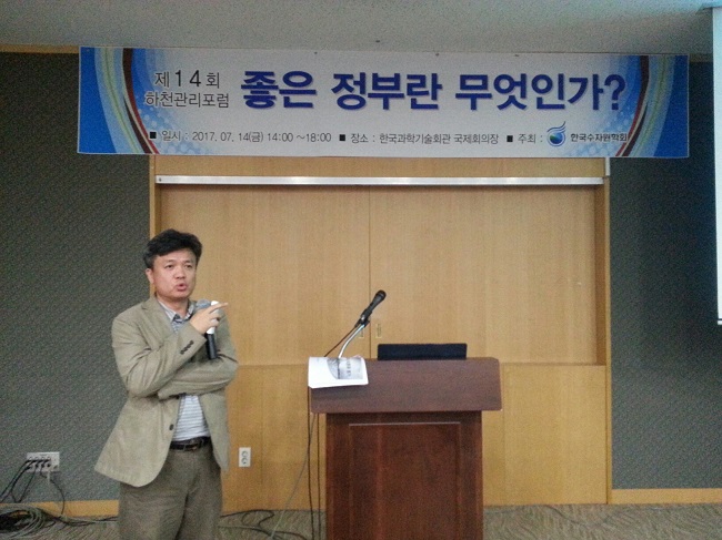 2017년 7월 14일(금) 한국과학기술회관에서 제14회 하천관리포럼을 개최하였습니다. ‘좋은 정부란 무엇인가’이란 주제로 토론의 장을 마련하였습니다. 80여명이 참석한 이번 포럼에서는 아래와 같은 내용으로 진행되었습니다.