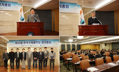 2018년 1월 26일에 17시에 건설회관 2층 대회의실에서 제52회 정기총회를 개최 하였습니다. 이번 정기총회에는 허준행 회장님 외 159명(위임 98명 포함)이 참석하여 진행되었습니다. 이날 시상식에서는 학회상 ,수자원특별상, 학회장표창, 감사패에 대한 시상을 하였고, 안건으로는 2017년 사업실적 및 결산과 2018년 사업계획 및 예산(안)에 대하여 심의, 의결 하였습니다