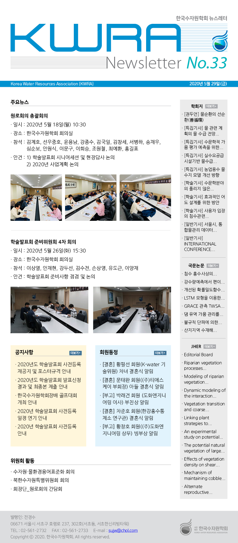 한국수자원학회 정기뉴스레터 33호(2020-05-31) 입니다.