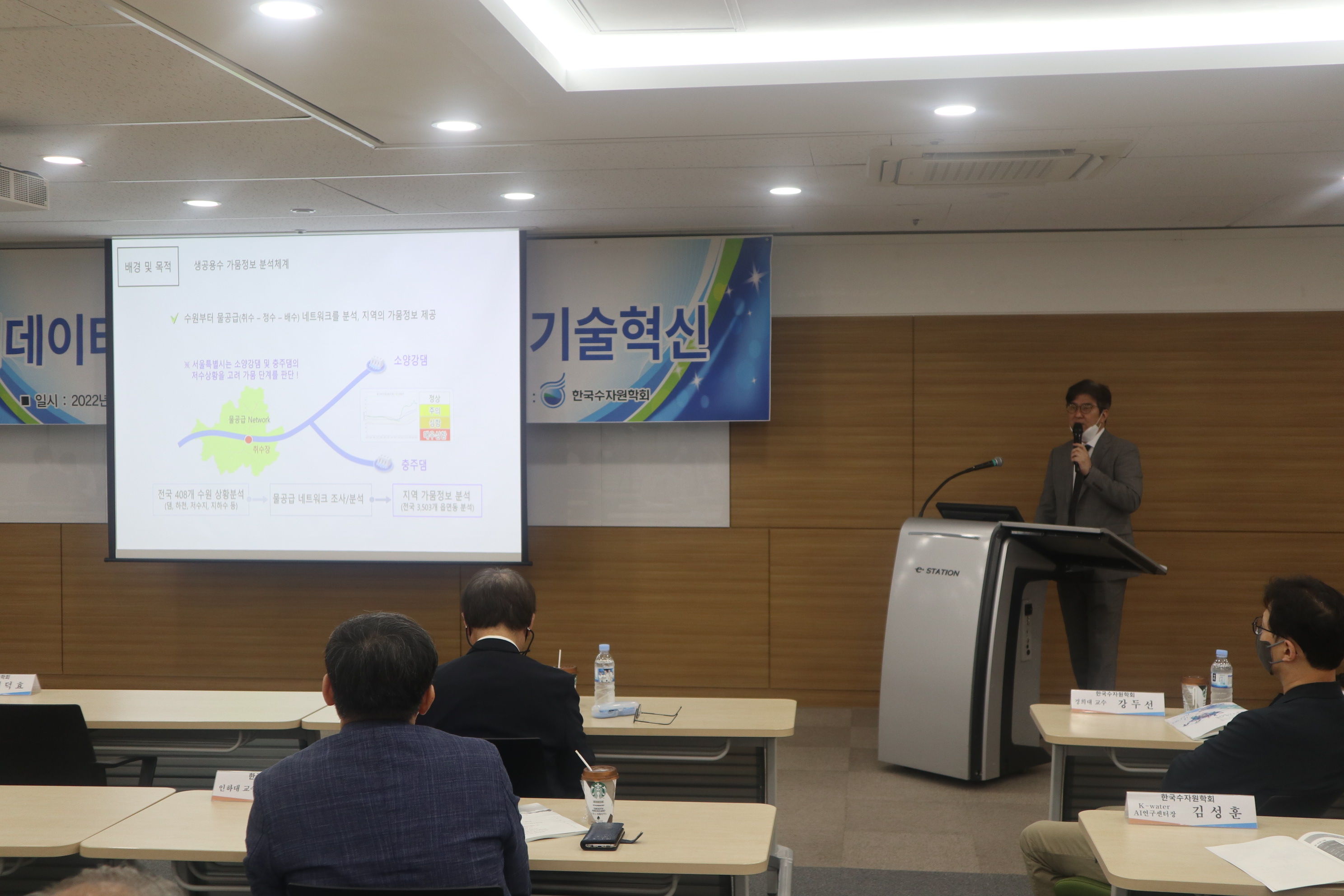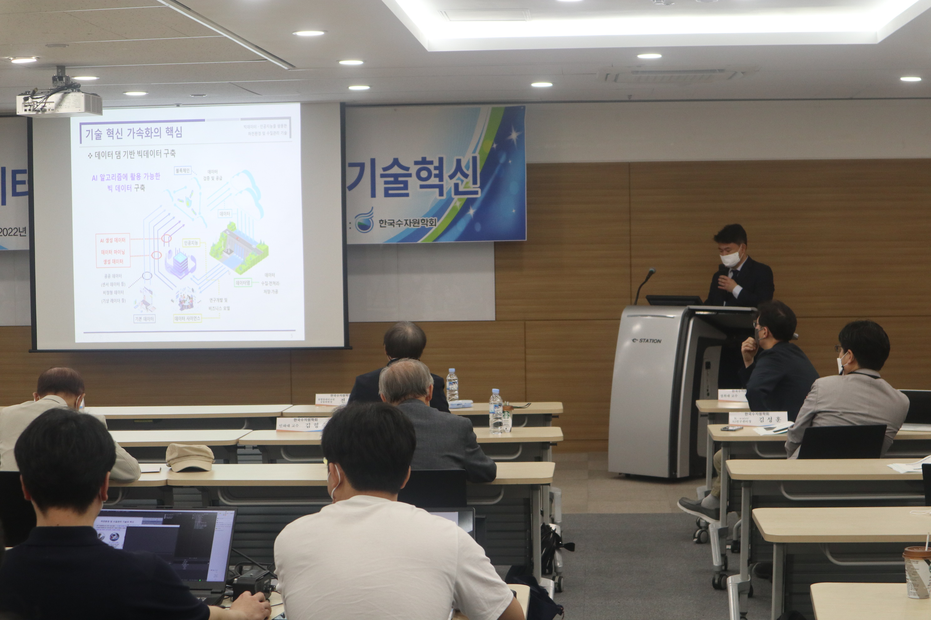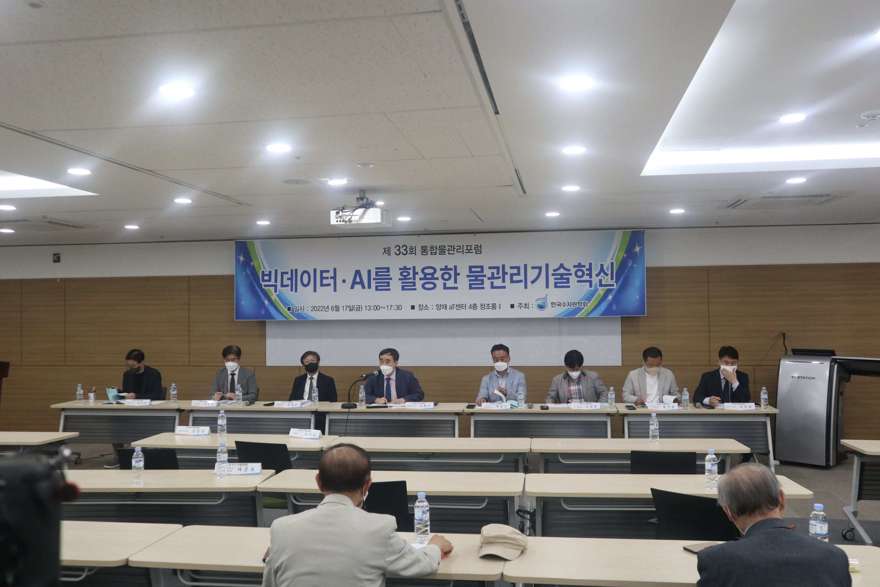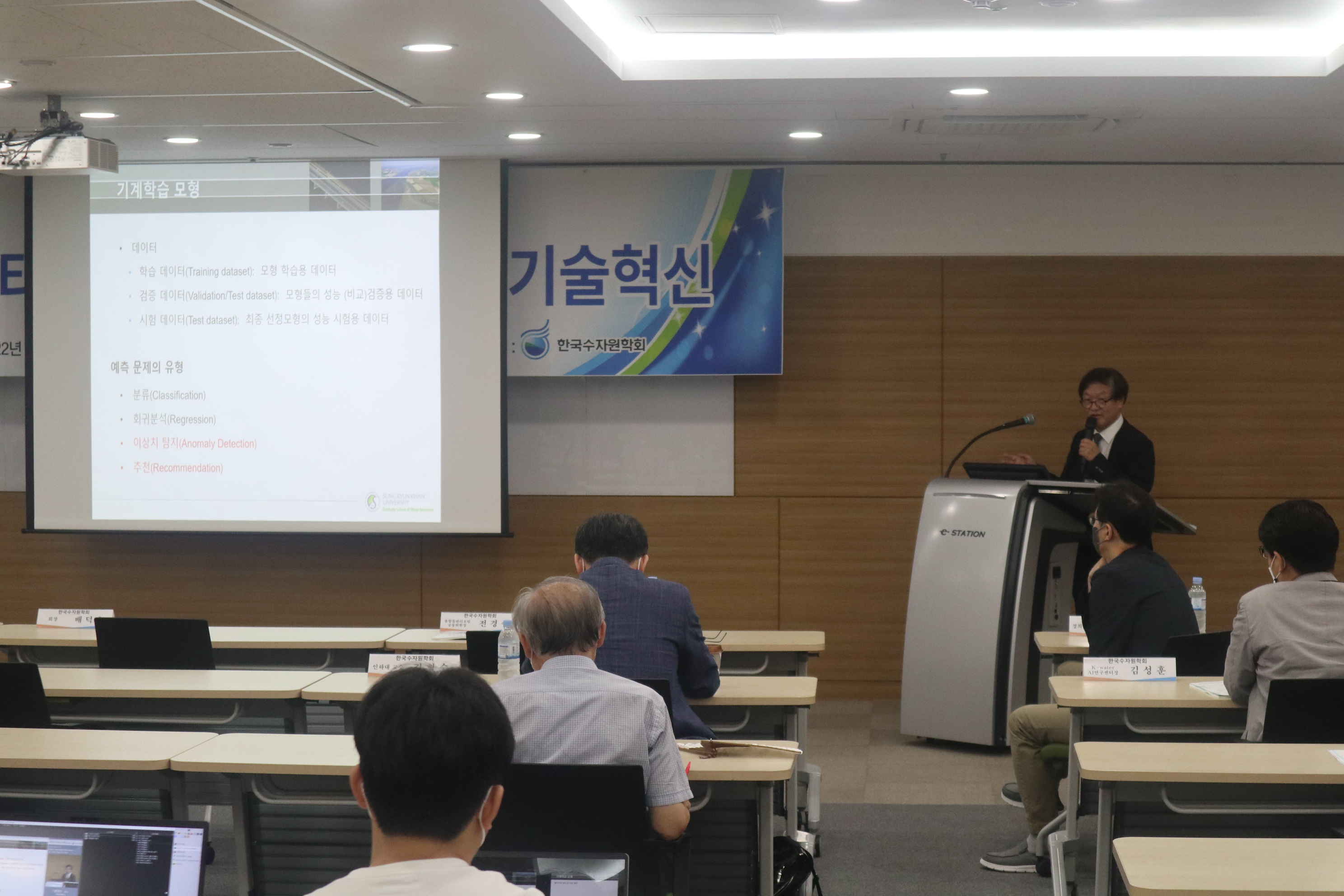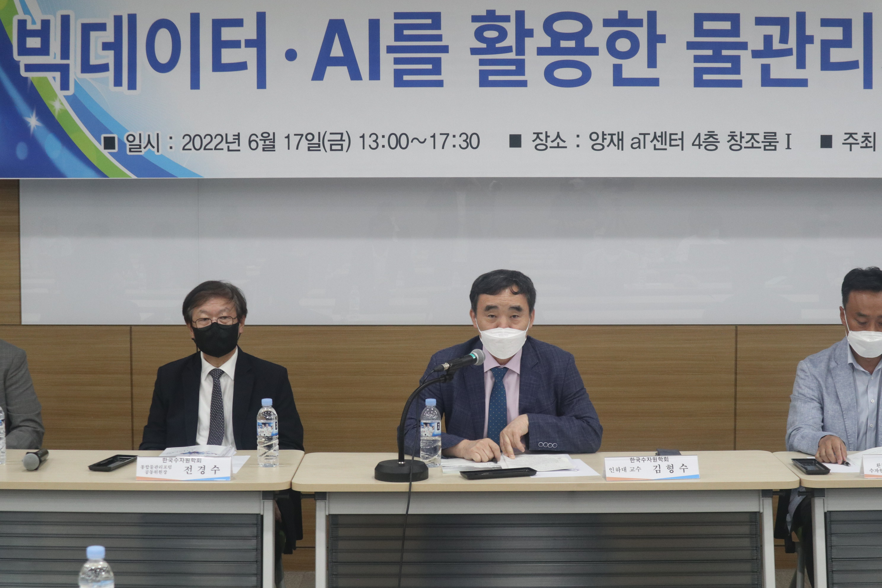 · 일시 : 2022년 06월 24일(금) 13:00 · 장소 : 양재 aT센터 4층 창조룸Ⅰ(온라인 병행) · 참석 : 배덕효 회장 외 90여명(온라인 참가자 포함) · 주제발표 : 빅데이터·AI를 활용한 물관리기술혁신 - 기계학습 모형을 이용한 홍수예측 / 전경수 성균관대학교 교수 - 안정적 용수공급을 위한 빅데이터·AI 활용기술 / 이정주 K-water 수석위원 - 빅데이터, 지능화 기술을 활용한 상수도 운영 및 관리기술 / 강두선 경희대학교 교수 - 빅데이터·AI를 활용한 하천환경/수질관리 기술 / 김준하 광주과학기술원 교수 · 지정토론 및 일반토론 - 좌장: 김형수(인하대학교 교수) - 패널: 박상근(환경부 수자원관리과), 차준호(한강홍수통제소 예보통제과장), 황석환(한국건설기술연구원 연구위원), 김성훈(K-water AI연구센터장)