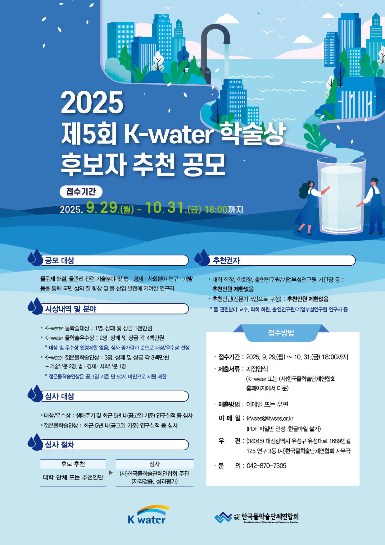 [외부공지] 2025 제5회 K-water 학술상 후보자 추천 공모(기간연장, ~10.31.(금) 18:00까지)