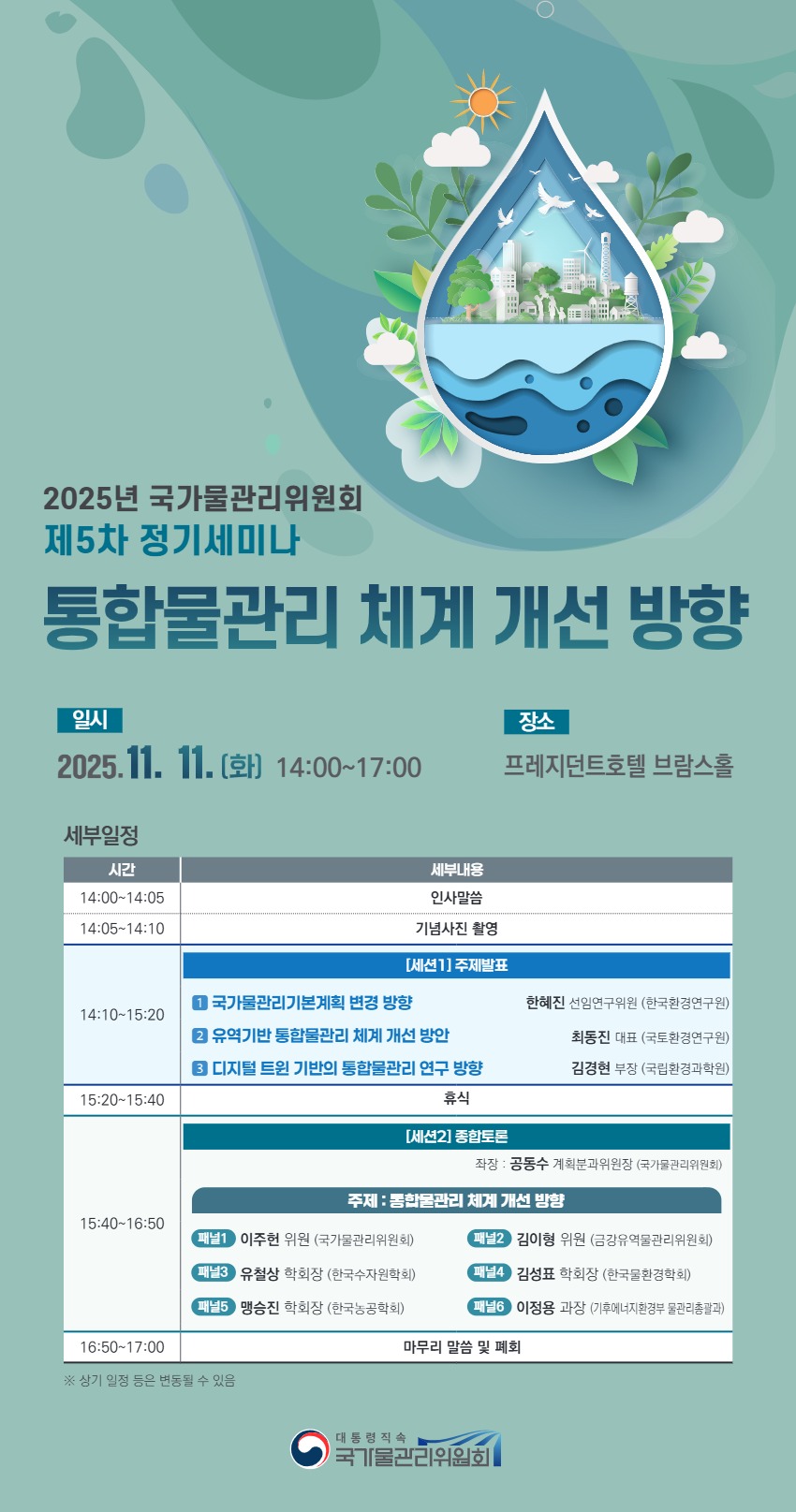 2025년 국가물관리위원회 제5차 정기세미나 개최 안내를 아래와 같이 알려드립니다.