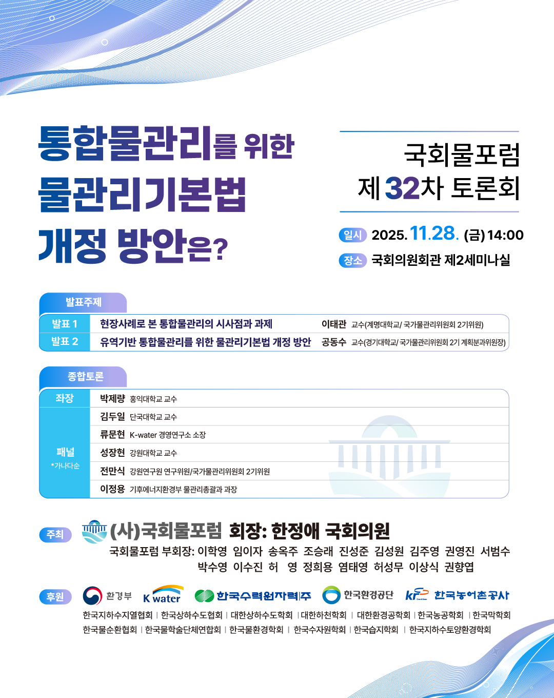 안녕하십니까. 국회물포럼 제32차 토론회 개최 안내를 아래와 같이 알려드립니다. 관심 있으신 회원 여러분의 많은 참여를 바랍니다. - 아 래 - □ 행사명 : 통합물관리를 위한 물관리기본법 개정 방안은? □ 일 시 : 2025년 11월 28일(금), 14:00 □ 장 소 : 국회의원회관 제2세미나실