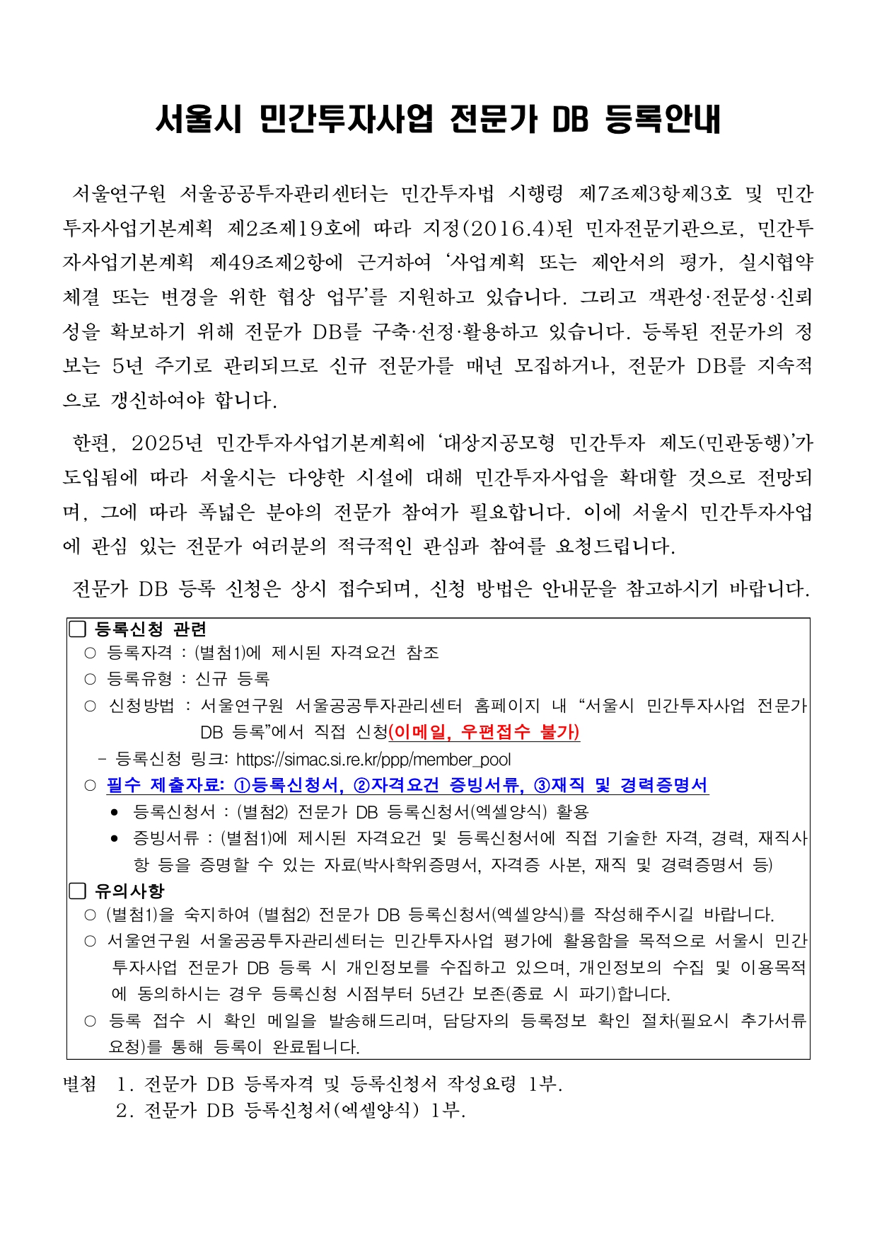 서울연구원에서 구축하고 있는「서울시 민간투자사업 전문가 DB」등록에 대하여 아래와 같이 안내드립니다.