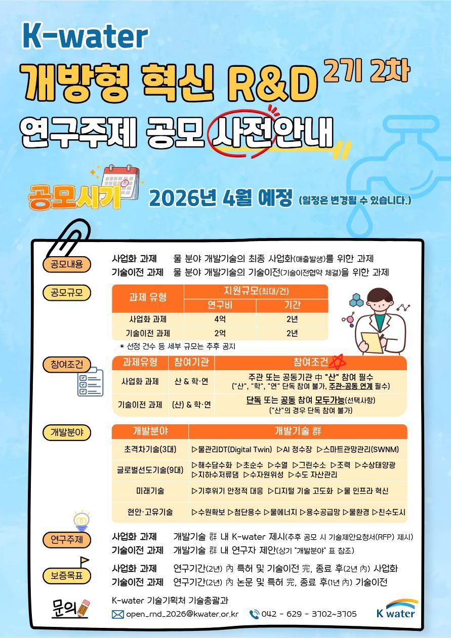 안녕하십니까. K-water 개방형 혁신 R&D(2기 2차) 연구주제 공모 사전안내를 아래와 같이 알려드립니다. 회원 여러분의 많은 참여 바랍니다. - 아 래 - ※ 세부 공모 내용, 지원 규모 등은 추후 공고예정